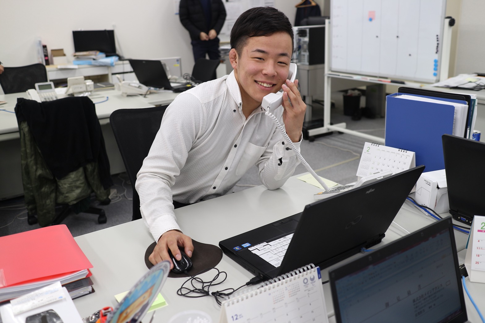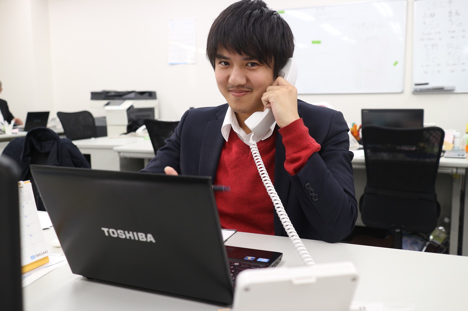 入社後は、今年入社の「少し上の先輩達」と一緒に、1人で商談に臨めるようになるまで成長していければ大丈夫です。例えば、お客様リストにある企業・店舗様に電話掛けでのアポ取りでも先輩社員が会話の始め方から丁寧に指導します。